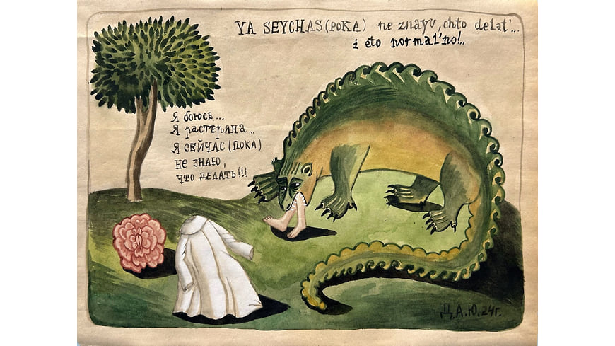 Одной из десяти новых выставок на территории ЦСИ «Винзавод» стала ретроспектива Павла Пепперштейна с «новыми старыми» рисунками, сделанными им в течение 50 лет (с 1974 по 2024 год). Самый ранний из них —- «Телеграмма» — появился, когда художнику было восемь. Сегодня он выставляет свои детские и юношеские работы в соавторстве с собой взрослым — что-то раскрашивает, что-то дорисовывает.