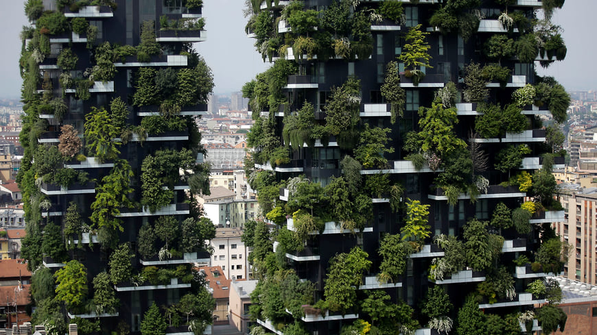 Bosco Verticale архитектора Стефано Боэри — две жилые башни, покрытые тысячами деревьев и кустарников. На каждом балконе есть слой грунта с системой для полива. Флора не только создает уникальный фасад, но и улучшает микроклимат, фильтрует воздух и снижает шум в квартирах, а также дает дом птицам и насекомым, обеспечивая биологическое разнообразие в городе. На момент завершения строительства высотки стали манифестом зеленой архитектуры — и попыткой ответить на вопрос, как с помощью небоскребов гармонизировать человеческие и природные экосистемы. Проект породил множество подражаний по всему миру — от Швейцарии до Китая.